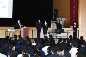 講演では、スーツ選びのポイントや清潔感を保つための管理方法、面接や訪問時の立ち居振る舞いなど、実生活で役立つ内容が多く紹介され、生徒たちはメモを取りながら熱心に聞き入っていました。