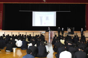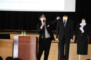 講演では、スーツ選びのポイントや清潔感を保つための管理方法、面接や訪問時の立ち居振る舞いなど、実生活で役立つ内容が多く紹介され、生徒たちはメモを取りながら熱心に聞き入っていました。