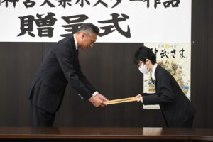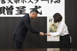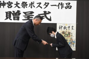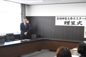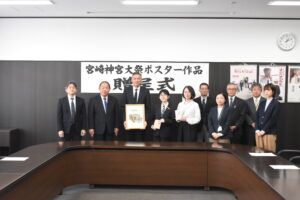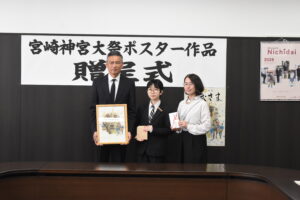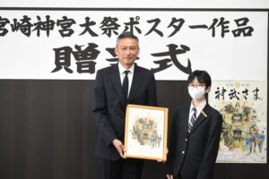 11月6日(木)、宮崎神宮大祭(神武さま)のポスター贈呈式が行われ、本年度のポスターに選ばれた荒武美千瑠さん(芸術科2年・大塚中出身)の作品が、宮崎商工会議所に贈呈されました。
