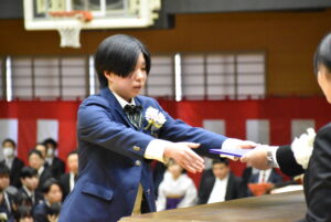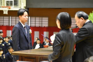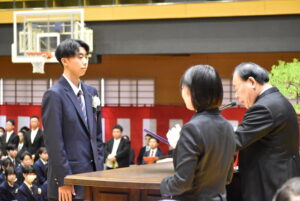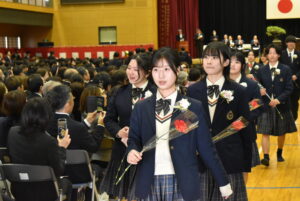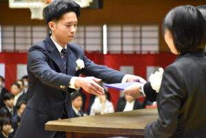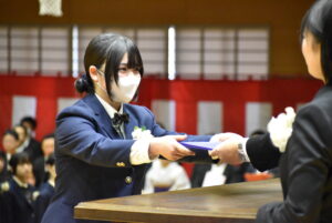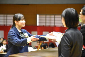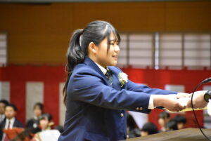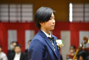 在校生代表送辞では尾上真白さん(英進2年)が、卒業生答辞では兼光優佳さん(総進3年)が、それぞれこれまでの思い出や感謝、そして未来への決意を述べ、会場は温かな拍手に包まれました。
