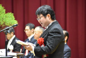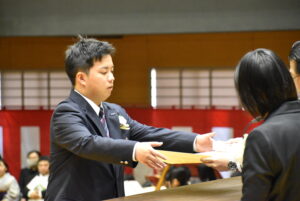 式では、各学科を代表して総代が登壇し、卒業証書を授与されました。続いて各部門における表彰が行われ、これまでの努力と成果が称えられました。