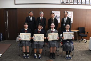 【宮崎地区納税貯蓄組合連合会会長賞】 峰山 美侑さん(3年) 【宮崎地区租税教育推進協議会 銅賞】 長友 恋羽さん(3年) 細屋 希愛さん(3年) 富山 凛さん(3年)