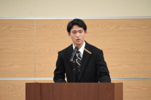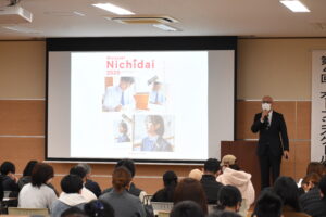 また、於田校長による学校説明に続き、卒業生の髙橋遼くん(特進1年)が体験談を発表。保護者代表の齊藤様からは、中高でのお子さまの成長の様子や、日大中学校の魅力について温かいメッセージが寄せられました。
