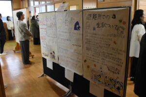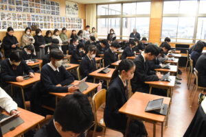 一方、1年生では防災教育の一環として、災害対応カードゲーム「クロスロード」を教材に使用。災害時の判断をテーマに意見交換が行われ、生徒たちは互いの考えに耳を傾けながら、多様な視点の大切さを学びました。